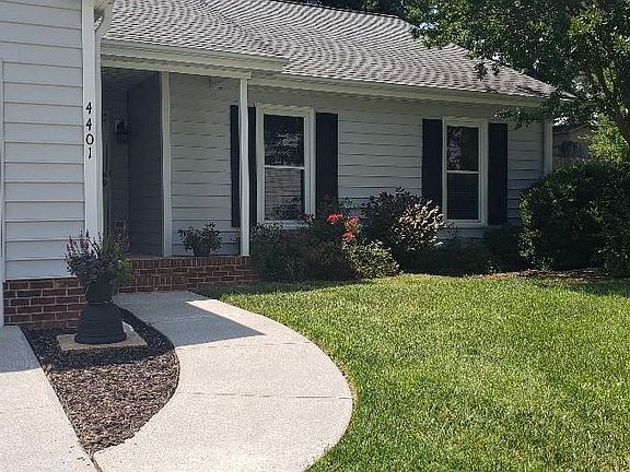 No HOA on this one story, vinyl exterior with vinyl windows, open floor plan, nestled on a cul de sac, in Jamestown NC. Close to all conveniences. 4401 Barndale Court features Volume Ceilings in Great Room and Primary bedroom/Bath, 2 bedrooms with the 3rd bedroom converted to office with French doors. Fresh paint throughout, vinyl plank flooring 6/25, updated lighting and fans, hvac/heat 3/25, garage door and motor 2/25. SS Kitchen Appliances. Refrigerator, washer, dryer and Great Room TV to convey. Have your morning coffee on the private patio listening to the birds and enjoying the Hibiscus and Crepe Myrtle in an expansive back yard fully enclosed by a 6 ft. privacy fence. This cute ranch is waiting for your touch and imagination to make it your Home Sweet Home. House About it?
