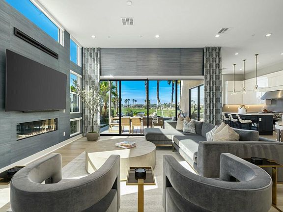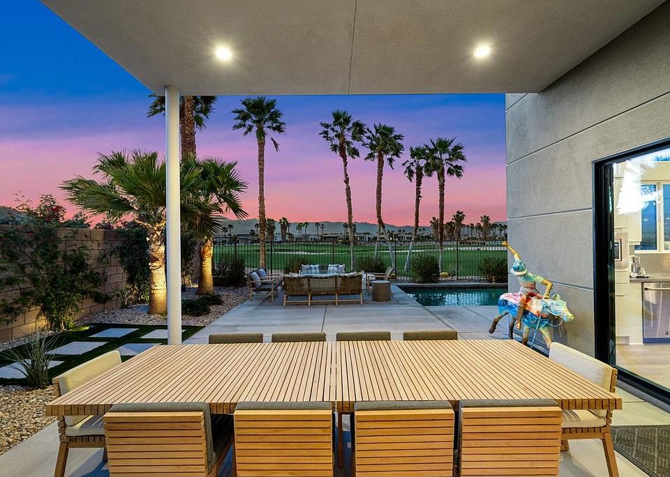 This one-of-a-kind Fig & Nash designed modern home with gorgeous mountain views is in the gated community of Escena! Built in 2023, this 3-bedroom, plus office, 4-bathroom home offers 2,598 sq. ft. of luxurious living space. Situated on a double fairway of the acclaimed Escena Golf Course, the property boasts phenomenal panoramic 180 degree western and northern mountain views. With over $300K in builder and owner upgrades, the home features 12 ft. ceilings, clerestory windows, designer light fixtures and beautiful custom wallpaper. The gourmet Chef's kitchen with a Quartz island, extended cabinetry and a walk-in pantry, features Jenn Air appliances that include a double oven, dishwasher, microwave & refrigerator. Enjoy an open floor plan, luxury vinyl tile (mimicking a hardwood floor look) throughout, a great room with fireplace, wet bar with sink & wine refrigerator, and stackable sliding doors leading out to a beautiful, covered patio and back yard. The gorgeous primary suite has custom vanities & cabinetry, large soaking tub, quartz counters and sliding door access to the pool and spa. The two guest bedrooms, both with well-appointed ensuite bathrooms, are thoughtfully separated from the Primary suite. The outdoor space is an entertainer's dream featuring a covered patio for dining, salt-water, PebbleTec pool with tiled raised spa, and a lovely seating area with firepit to enjoy the gorgeous panoramic mountain views. Additional highlights include motorized blinds throughout, a powder room, laundry room with a sink & cabinetry, 2-car garage with epoxy floor & owned solar. Experience luxury, modern convenience, and spectacular views in this warm and inviting Palm Springs home!
