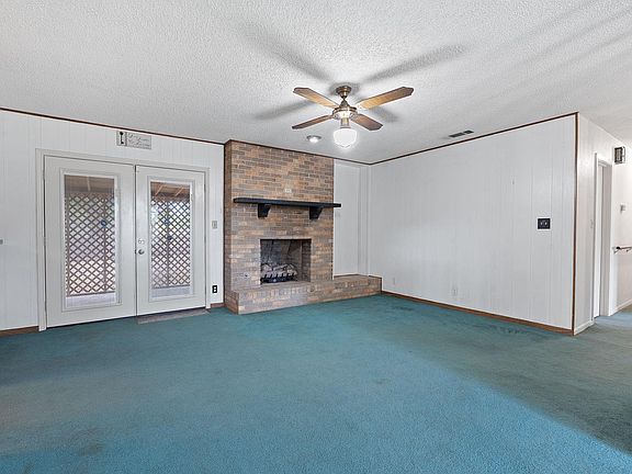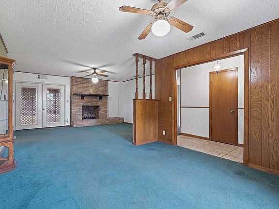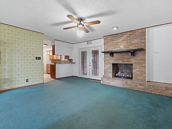 Timeless mid-century characterStatement brick fireplaceSpacious backyardMature pecan treesOriginal kitchen cabinetry