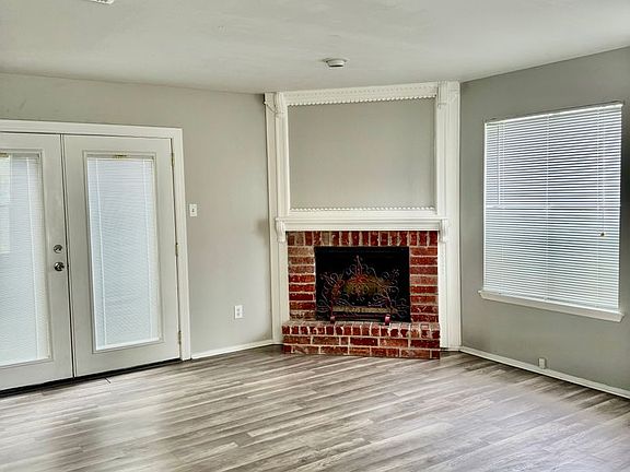 Step inside to fresh paint, updated fixtures, and durable wood plank flooring throughout. Stay comfortable year-round with central air and heating and enjoy the ambiance of the brick wood-burning fireplace, the centerpiece of the cozy living area. French doors lead to your private patio, perfect for relaxing outdoors.