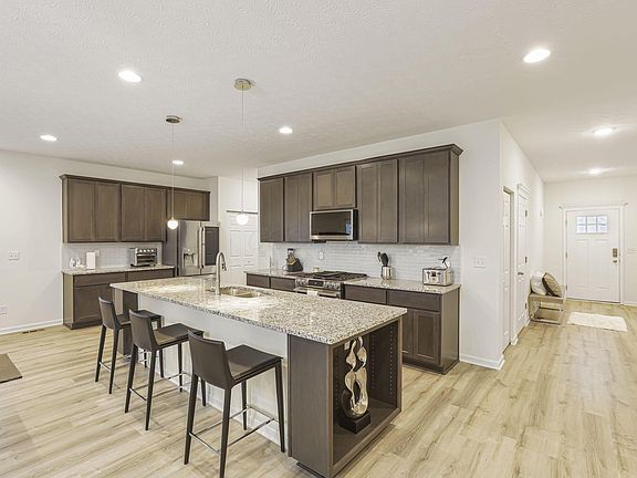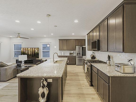Spacious great room with upgraded lighting and a gas log fireplace framed in granite. Chef's kitchen features a large island with seating, granite countertops, soft close cabinets, and LG Studio stainless steel appliances. Flex room with French doors sits just off the main living area and offers the perfect space for an office or additional seating, complete with sliding doors that open to a covered deck, patio, and backyard.