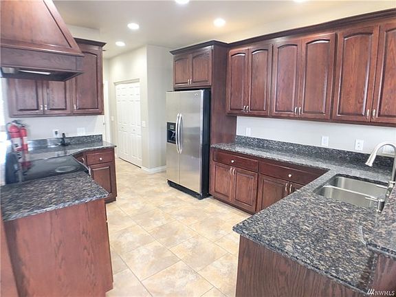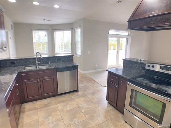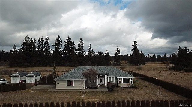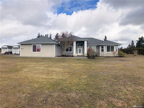 Custom built luxury rambler on 5 level acres with magnificent Mt Rainier views! 4 bedrooms/2.75 baths, split bedroom floor plan, great room concept, vaulted ceilings with transoms. 5-piece master bath with his/her walk-in closets that have hookups for 2nd washer & dryer. Granite tile & custom cabinetry complete with an oversized 2-car garage, front & back patios. Plenty of space for your dream shop & horses! New carpet throughout.
