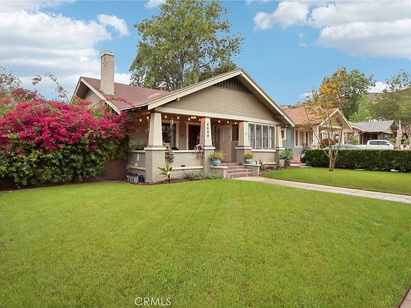 Welcome to this charming 1923-built Craftsman home, perfectly situated on a beautifully landscaped corner lot in the heart of Riverside. From the moment you step onto the tiled front porch, you’ll feel the timeless character and warmth this home offers. Inside, original real wood floors, tall baseboards, and gorgeous wood trim flow throughout, complemented by an abundance of windows that fill the space with natural light. The inviting living room features a cozy wood-burning fireplace and opens seamlessly to the dining area—ideal for gatherings and everyday living. The updated kitchen is both functional and stylish, with white cabinets, granite countertops, a white tile backsplash, stainless steel appliances, recessed lighting, and a charming breakfast nook. Off the kitchen, you’ll find a separate laundry room with ample storage. The renovated bathroom showcases matching white tile on the floors and walls, a sleek quartz-topped vanity, and a tub/shower combo. The spacious first bedroom includes real wood floors, white trim, a ceiling fan, and a walk-in closet, with double doors leading to a versatile bonus room perfect for a retreat, office, or third bedroom. The second bedroom also features real wood floors, white trim, a ceiling fan, and direct access to the lush backyard through double doors. Outdoors, enjoy mature landscaping, fruit trees, a designated gardening area, and plenty of space to relax or entertain. A detached two-car garage and generous driveway offer ample parking. All of this can be found just down the street from the Mission Inn, The Food Lab, Fox Theater, Mount Rubidoux and Fairmont Park. Don’t miss this opportunity to own a beautiful piece of Riverside history.