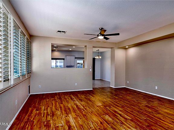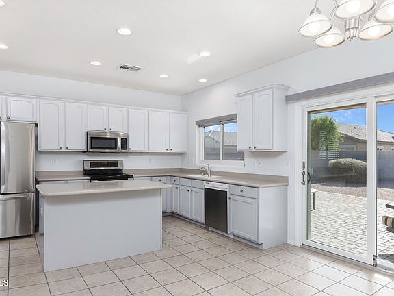 This immaculate, move-in-ready corner lot home offers a perfect blend of comfort, style, and functionality. Featuring 3 spacious bedrooms, including a private split master suite, plus a versatile den that can serve as an office, playroom, or formal dining area—this home adapts to your lifestyle.The expansive master suite is a true retreat, complete with a large, beautifully tiled walk-in shower in the en-suite bath. The generously-sized secondary bedrooms offer a cozy and inviting feel.The open-concept living area boasts gorgeous tile flooring throughout and plantation shutters, complemented by neutral paint tones that create a bright, airy atmosphere. The kitchen is a chef's dream, with an island and ample counter space perfect for preparing meals and entertaining guest. Step outside to your serene, low-maintenance desert landscapeideal for Arizona living. The south-facing covered patio, with custom extended pavers and ceiling fan provides the perfect spot to relax or entertain while enjoying the outdoors in privacy. Additional highlights include a 2-car garage with plenty of built-in cabinets for extra storage and a designated work area for your tools or projects. Across the street from the community park, this home is a rare find!