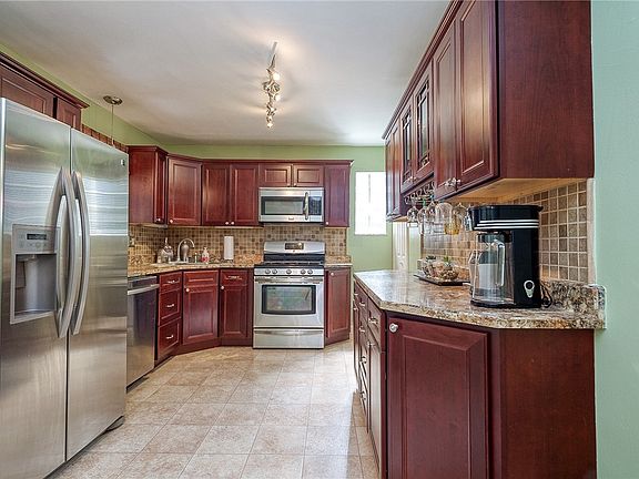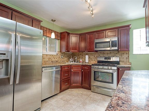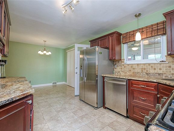 Welcome home to this beautiful all brick ranch style home with 2 car garage on a nice lot in a quiet neighborhood. The stylishly updated main level features a large 20 by 13 foot living room with hardwood flooring, and a gorgeous kitchen, which opens to the dining room. The cherry kitchen has soft close drawers, chic lighting, and stainless steel appliances over newer Dupont travertine flooring. The dining room leads to a Champion three season sunroom that is a lovely space to let the outdoors in. The spacious master features hardwood flooring and its own beautifully renovated ensuite bathroom, while two other bedrooms have carpeting and large closets. Another full bath features a high end cherry vanity, ceramic tile flooring, newer lighting and fixtures. The laundry room and half bath are on the lower level, as is the big family room is with a stone gas fireplace. Outside is a nice yard, an above ground pool with deck and an additional deck, shed and large driveway. Newer mechanics.