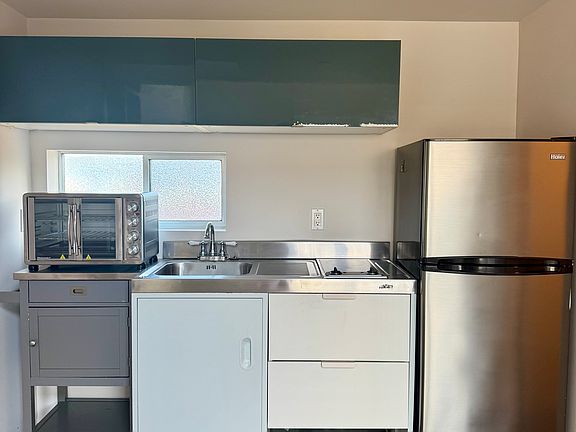 Stainless Steel Refrigerator | Electric 2-Burner Cook Top | Countertop 2-Door French Oven | Kitchen Sink & Refuse Disposal | Pantry