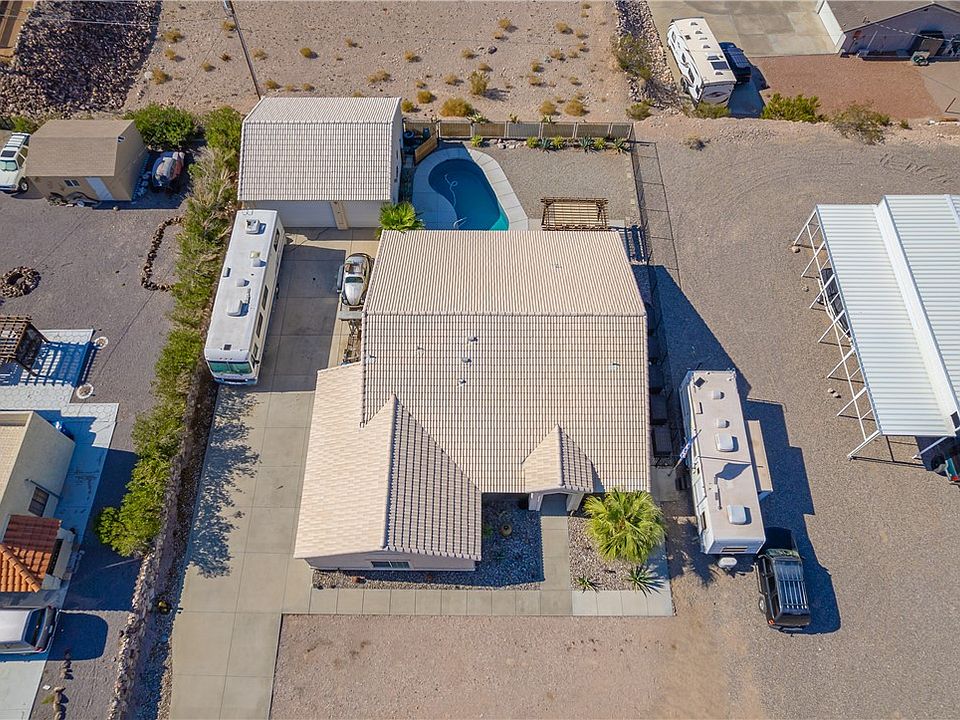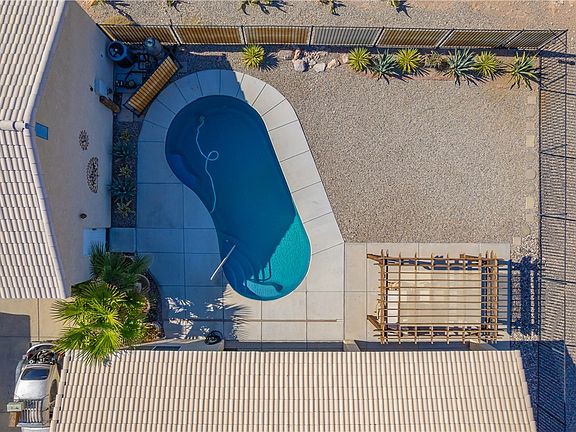 Nestled on the outskirts of Bullhead City, this single-family residence presents an attractive property with so many amenities, ready to welcome you home. The living room is a captivating space, defined by its high ceiling and vaulted ceiling, which create an airy and expansive atmosphere, further enhanced by tile flooring and abundant natural light. The kitchen is equipped with beautiful oak raised-panel cabinets, tile backsplash, a kitchen peninsula, and a kitchen bar, creating a functional area to prepare food and beverages. The master bedroom features an ensuite bathroom, offering a private retreat within the home. The bathroom is complete with a double vanity and a walk-in shower. The walk-in closet provides ample storage space, keeping your belongings organized and accessible. There are 2 additional bedrooms and a full bathroom as well. Step outside to discover an outdoor living space designed for relaxation and entertainment, featuring an outdoor kitchen, an outdoor dining area, and an outdoor bar, perfect for hosting gatherings or enjoying quiet evenings. A private pool awaits, offering a refreshing escape from the Arizona heat, while the pergola provides a shaded retreat. The fenced backyard ensures privacy and security, while the patio creates inviting spaces for outdoor enjoyment. The property further benefits from a laundry room, offering convenience and practicality. The large attached garage is supplemented by an additional detached shop. There is plenty of room for parking RVs, boats, and all your vehicles! This is a residence that captures the essence of Arizona living, offering a blend of comfort, style, and outdoor enjoyment.