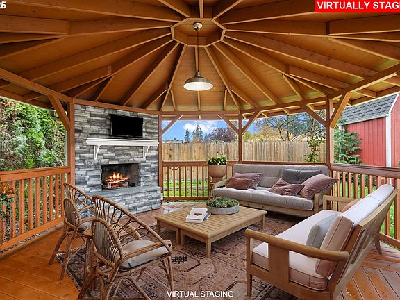 Welcome to this spacious and beautifully maintained home featuring a warm, open layout and numerous upgrades throughout. The living room is a true centerpiece, showcasing a floor-to-ceiling stone fireplace flanked by custom built-ins, creating both elegance and coziness.The kitchen is designed for both everyday living and entertaining, offering granite countertops, a tile backsplash, tile flooring, stainless steel appliances, and ample pantry space for storage.Each bathroom has been tastefully updated with granite countertops and white cabinetry, providing a clean, modern feel. The main living areas and bedrooms feature laminate flooring, blending durability with a contemporary look.Step outside through the living room to a private deck, ideal for relaxing or enjoying morning coffee. The backyard is a true extension of the living space. Also, outdoor access from primary bedroom. Backyard offers a tool shed but the best part is a 144-square-foot covered gazebo equipped with electricity, a wood-burning stone fireplace, and a mounted TV—perfect for entertaining in any season.This home also includes all appliances and features a solar photovoltaic system, helping to reduce energy costs and support sustainable living.