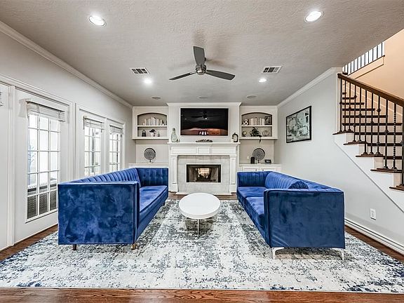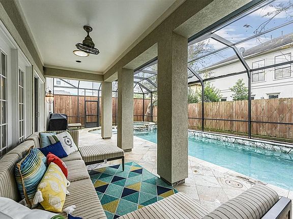 Beautiful well maintained home w/open floor plan. Oak hardwood floors throughout w/crown & base moldings. Chef's kitchen w/Wolf appliances, Carrera marble countertops warmly lit by a Schoenbeck crystal chandelier. Marble breakfast bar w/seating for 4. Kitchen opens to elegant large family room w/surround sound, built-in framed TV, cabinets on each side of F/P & wall of paned windows that lead to a heated saltwater pool & spa w/waterfall & Florida screened stone patio. Master suite includes bath w/a jetted tub lit by a crystal chandelier, white cabinetry, glass shower & dual sinks w/marble countertops. Oak staircase leads to 3rd floor which is used as a 5th bedroom or office & has a Velux skylight & cedar closet w/glass doors. Arched entry 2 car garage w/white epoxy coated showroom quality floor. Upgrades include solar panels ('09), metal roof ('14), fenced yard, Huff landscape lighting, 2 HVAC ('14 & '17), 2 new water heaters (Dec '18), & Endless Pool machine ('09).
