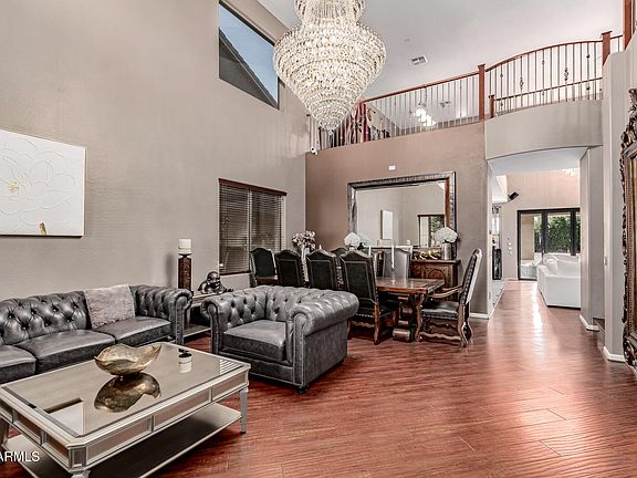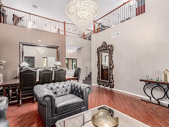 Luxury resort style living in award winning Anthem,AZ. Step into unparalleled elegance and modern sophistication at this stunning Anthem masterpiece. As you enter, a custom crystal chandelier greets you in the grand foyer, setting the tone for luxury throughout. The heart of the home—the open-concept main living area—boasts a second breathtaking custom crystal chandelier as its centerpiece, creating a dazzling focal point for entertaining. Seamlessly blend indoor and outdoor living with 15-foot bi-fold doors that open to your private backyard oasis. Dive into the sparkling pool with three sheer descent waterfalls, grill in style at the built-in BBQ with granite countertops, and unwind in your own resort-style retreat. Dedicated theater room with Sony 3D system, new luxury flooring. Upgraded gourmet appliance package to include side by side stainless steel refrigerator with wifi, look in the fridge from the store to see what you need! 64 panel solar system, no power bill for years! All this and the award winning community of Anthem featuring a 45,000 sq ft community center, water park and skate park, tennis/pickleball courts, playing fields, fishing lakes, rock climbing wall and a community train!