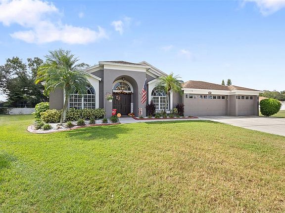 Tucked away in the heart of the highly sought-after Nature’s Way Bloomingdale Community, this 4-BED, 3-FULL BATH, POOL home is the gem you’ve been dreaming of that just so happens to be located on the LARGEST LOT on the CUL-DE-SAC. With 2584 sq ft of thoughtfully designed living space, a 3-CAR GARAGE & NO REAR NEIGHBORS, this home is where memories are made. Step inside to soaring VAULTED CEILINGS, fresh INTERIOR & EXTERIOR PAINT, UPDATED LIGHT FIXTURES, FLOORING & CEILING FANS that adds a modern, yet cozy charm to the home. The front rooms of the home is where you’ll find the FORMAL LIVING & DINING ROOMS that not only offer plenty of space for hosting holidays or game nights, but also feature a decorative SHIPLAP wall & LARGE WINDOWS that bring in a lot of NATURAL LIGHT. The heart of the home, the OPEN KITCHEN & FAMILY ROOM, features GRANITE COUNTERTOPS, a stylish BACKSPLASH, STAINLESS APPLIANCES, WALK-IN PANTRY & a STORAGE CLOSET. Large SLIDING DOORS lead out to the SCREENED LANAI that wraps around a 14’ x 29’ IN-GROUND POOL. These doors open all the way to extend the space of the family room as well as letting in the cool Florida breezes in the Winter. The PRIMARY SUITE is its own slice of serenity that stretches the entire length of the house. In there you will find two WALK-IN CLOSETS, a cozy SITTING AREA flanked by windows & sliding doors that lead to the pool area. The ENSUITE BATHROOM has a PRIVATE COMMODE CLOSET, GARDEN TUB, WALK-IN SHOWER & DOUBLE VANITIES with plenty of STORAGE. On the other side of the home you will find a guest bath, two bedrooms and a spacious laundry area complete with STORAGE CABINETS, LAUNDRY TUB & FOLDING COUNTER all hidden behind a FARM-HOUSE CHIC BARNDOOR. In the back of the home is where you’ll discover the fourth bedroom with ENSUITE that leads directly to the backyard oasis. This space is ideal for guests, MULTI-GENERATIONAL LIVING or that HOME MOVIE THEATER you’ve always wanted. The community has a PARK, PLAYGROUND, PICKLEBALL, TENNIS & BASKETBALL courts, public GOLF COURSE and TOP-RATED schools & is minutes away from shopping, a hospital & restaurants. This property offers both comfort & style, perfect for growing families or anyone seeking a spacious living environment. Welcome Home!