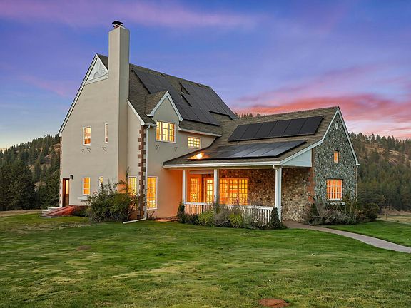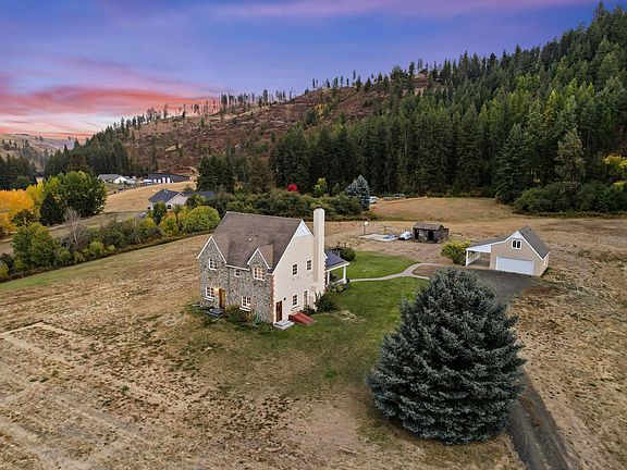 Discover peaceful country living in this solar-powered estate on 10 acres, with views of Latah Creek. Built in 1992 & recently updated, this 4,100 sq ft home blends timeless architecture with modern comfort. Inspired by a 15th-century farmhouse, its rock & red sandstone exterior is framed by old-growth pine & tamarack trees. Inside, enjoy an open layout with wood-wrapped windows, solid wood doors, built-ins, & a striking stone fireplace. Re-purposed antique doors with original antique door knobs add charm & character throughout. Views from every room! The 5-bedroom, 3-bath design includes a spacious primary suite plus a main floor bedroom with adjoining bath—ideal for multigenerational living or private guest quarters. Recent updates include fresh interior & exterior paint, refinished solid maple flooring, & beautifully remodeled baths. Just a quick drive to all South Hill has to offer. Adjacent 10 acre parcel available separately. Don't miss out on this rare Valleyford estate!