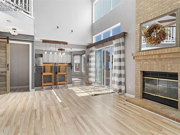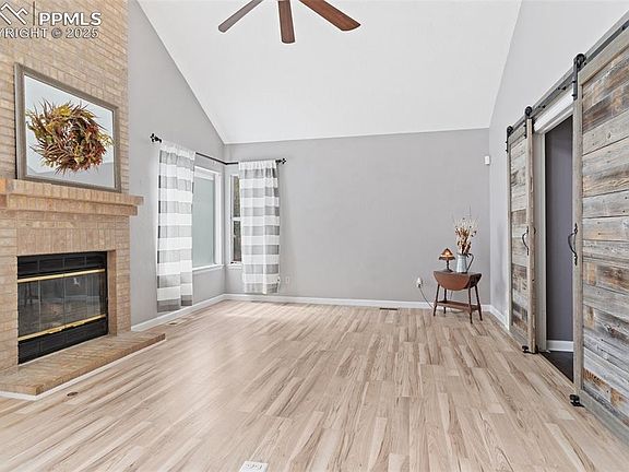 You must see this charming 2-story home with fully finished basement featuring 6 bedrooms, 4 baths and 2 car garage in a great location. The bright main level boasts a living room with adjoining kitchen, large dining room, bedroom, 3/4 bath and laundry (washer/dryer included). The cook will love the updated kitchen which displays ample cabinets and counter space, custom tile backsplash, large island and a counter bar with informal seating, pantry and a breakfast nook. Newer SS refrigerator, range and microwave are included. Adjacent to the kitchen is a spacious dining room with bay window that's so perfect for gatherings with family and friends. Relax in the comfortable living room boasting soaring ceilings and a dramatic 2-story gas brick fireplace. This room provides access to the amazing back patio. On the upper level, an attractive barn door grants entry to the expansive master suite highlighted by vaulted ceilings, skylight, crescent window, dressing area, walk-in closet and 5-pc bath featuring a double vanity. 2 additional bedrooms and full bath complete the upper level. A 2nd barn door accesses the staircase to the finished basement which includes a spacious family room, 5th & 6th bedrooms, full bath and huge storage room. Bedroom 5 includes a wall-mounted TV. Flooring throughout the main & upper levels is new laminate and the basement features new carpet. The large backyard, dotted with mature trees, is fully fenced and features a 40x20 patio with hot tub & patio heater for your utmost outdoor enjoyment. 2 storage sheds & a chicken coop are also included. You will appreciate the NEW ROOF installed April 2024, plus NEW: Furnace, A/C, Water Heater, Water Filter/Softener, Exterior Paint, Light Fixtures, Ceiling Fans, 2 Decorator Barn Doors. This home is in excellent condition! Only minutes from Peterson AFB, shopping and schools. Fort Carson is a short drive. Move-in ready! No HOA!