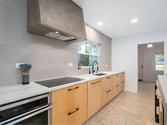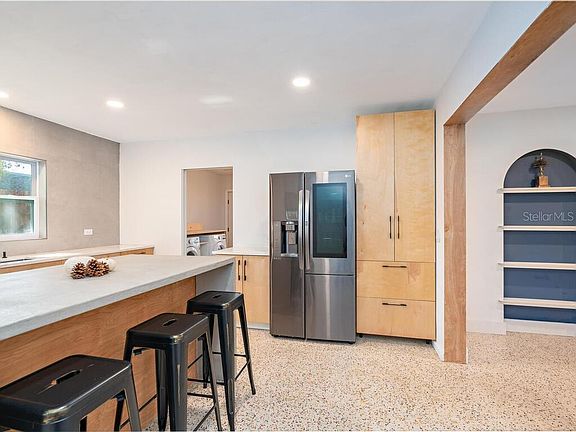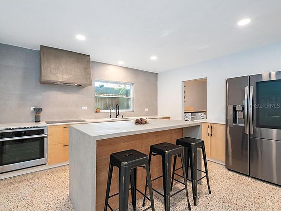 This freshly renovated, mid-century modern, block home rests on an estate-sized, two-thirds of an acre lot in central Sarasota. The home has two large bedrooms and a third bedroom/office on the opposite side of the home, providing for a quiet space to get work done remotely. Entertain in the kitchen with seating at the island to show off the new high end stainless steel appliances - including a Samsung high powered steam enabled oven, Frigidaire induction cooktop and hood, Double door fridge with clear door, and built in cabinet panel dishwasher. The kitchen also features soft close cabinetry with pull-outs, Calcutta quartz countertops, induction cooktop and oversized walk-in pantry. The Florida room provides additional charming space with tongue and groove ceilings. The bathroom in the main house was just expanded to make room for a relaxing new walk-in shower and sleek vanity. The laundry room is oversized with a new LG washer and dryer. The detached, oversized two-car garage with a full bath makes for an excellent man cave or shop for woodworks and more. Other notable updates include new AC, new water heater, landscaping, doors, window treatments, large privacy fence, plumbing and electrical updates with grounding and new electrical panel. Zoned RMF-2 with lots of possibilities - split off one to two lots to sell or build and keep the existing home. Use as an investment and tear down in the future for up to 5 single-family lots or a multi-family dwelling with 6 units. Call for details.