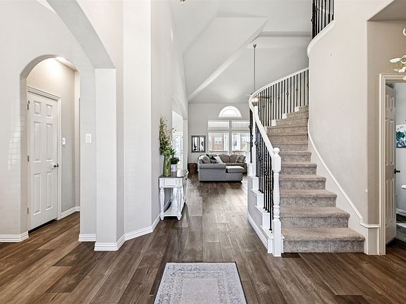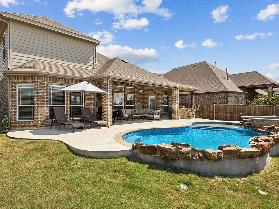 Better than new with pool, spa and outdoor kitchen located in Prosper ISD perfectly located close to shops and restaurants. This First Texas beauty has 3,329 sq ft with 5 spacious bedrooms, 4 full baths, as well as 2 versatile flex spaces — perfect for a home office, media room, or additional guest space. Step inside to a grand two-story entryway with a sweeping spiral staircase that sets the tone for this open-concept floor plan. Two-story living room is anchored by a striking gas fireplace open to the upstairs gameroom—ideal for entertaining. The heart of the home is the gourmet kitchen, complete with a large breakfast bar, built-in oven, gas cooktop, butler’s pantry, and charming plant ledge with window. Enjoy meals in the sunny eat-in kitchen or host formal dinners in the separate dining room with a bay window. The private primary suite is located on the main floor and boasts direct access to the backyard oasis, a luxurious ensuite bath with garden tub, walk-in shower, separate dual vanities, and a spacious walk-in closet. A second downstairs bedroom and full bath are perfect for guests or in-laws. Upstairs, you’ll find 3 additional bedrooms and 2 full baths, including a Jack & Jill layout and a separate private suite, along with the central gameroom. Step outside to your own private retreat! The covered patio leads to a brand-new gunite pool and heated spa with waterfall feature and stone accents, plus a built-in outdoor kitchen with gas grill and refrigerator—perfect for year-round entertaining.