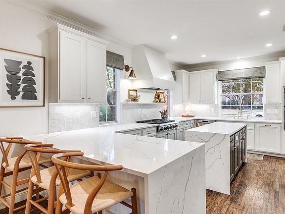 Large poolFour bedroomsStunning waterfall islandWhite quartz countersGas cooktopGold accentsWhite cabinets