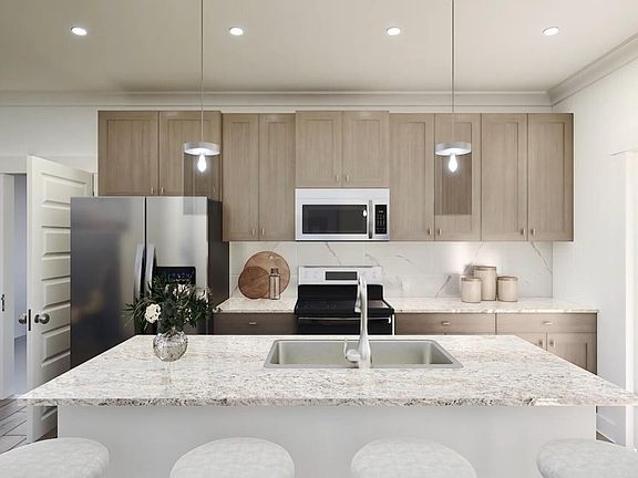 LAKE view and CORNER lot!! Welcome home to the Springdale! You'll love this 2 story home with custom features such as coffered ceiling in the dining room, trey ceilings, quartz countertops, and a private balcony off of the primary bedroom. Find all the room you need to entertain as the open living and dining room flow onto the covered patio. A large bedroom and full bathroom on the first level are perfect for multi-generational living or a home office. Enter an inviting feel on the second level to find 4 more bedrooms! Trey ceilings included in every room and the 5th bedroom may also be used for a media room or secondary living area. This home is sure to impress! Owl's Head East features walking trails, green space, & a Spring Fed lake.
