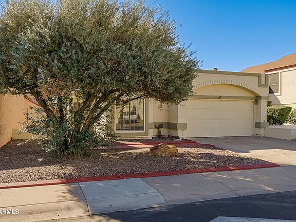 Welcome to your charming 2 bed, 2 bath, 2 car garage single-family home in Merit Estates. A thoughtful split floor plan offers ideal privacy,with bedrooms on opposite sides of the home. Enjoy the spacious feel of a vaulted ceiling in the main living areas, enhanced by natural light from a corner window in the kitchen, skylights & double pane energy-efficient windows.The kitchen, while compact, offers ample storage space, & the dining area features a built in decorate/pot shelf. The large primary suite easily accommodates larger furniture & includes a walk-in shower & a walk-in closet for convenience. An indoor laundry area makes daily chores easy-especially during our Arizona summers! Step outside to a fenced yard with a covered patio.The two car garage provides direct access to the home.