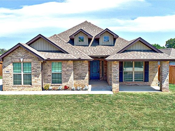 Beautiful 4 bedroom, 2 bath brick home built by Schuber Mitchell. Wood look ceramic tile throughout the open kitchen and living area. Electric fireplace. Dining area as well as a long island bar for entertaining. Kitchen has stainless appliances, gas cooktop and a pantry. New carpet in bedrooms. Primary bath has dual vanities, soaking tub and a large shower. Garage has epoxy floor. Large fenced yard with a drive gate. Nice covered patio extends the entertaining area. Better than new!