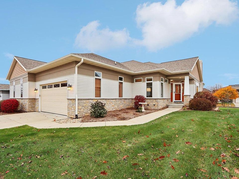 Stunning upscale Ranch! Beautiful hdrwd Kitchen w/Amish soft close Maple dove tailed Cabinets & big island drawings in the sun flooded Dinette & Opens to gorgeous Great Rm w/Gas frplc w/access to deck w/sunset views overlooking the large lot! 3 bdrms &3 baths-1st Flr Laundry off 2 Car Gar! King size Master w/Walk-In Closet & luxurious Bath w/ walk in Tiled Shower &Jetted Tub! Enjoy entertainment in the jaw dropping Fmly rm w/awesome Wet Bar, 2nd Gas Frplc! Lots of huge Anderson windows overlook lush yard! Zoned htg! Asso Fee Covers, exterior, driveway, sidewalk and deck supports, roof, lawn moving & snow removal. You can Grill in driveway. Enjoy POOL & CLUB HOUSE! Walk to GOLF COURSE & Park! Condo fee $315+$70 for pool &club house so total $385- Dues will increas to a total of $420 in 2025