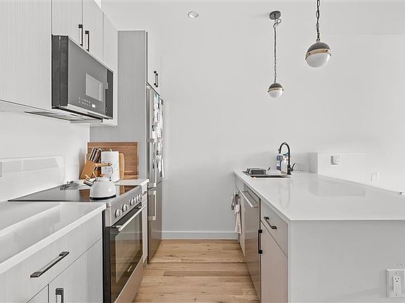 Sleek, modern kitchen outfitted with all-new stainless steel appliances including microwave & dishwasher