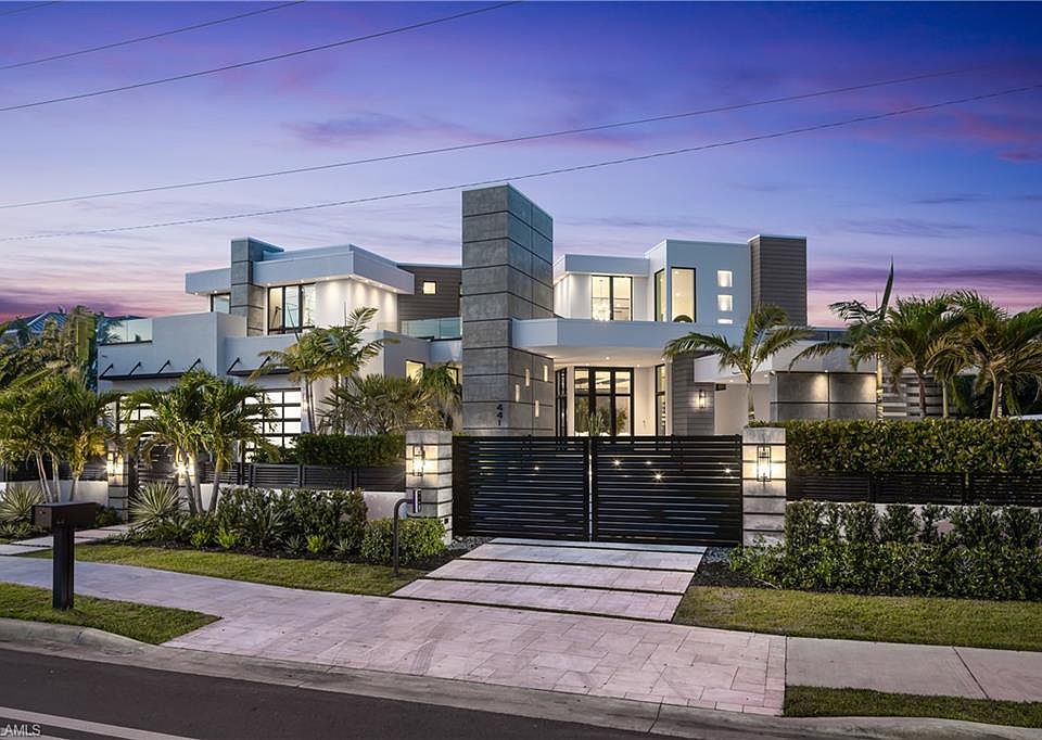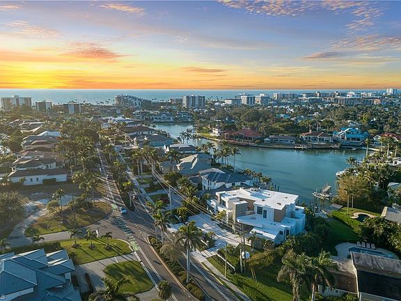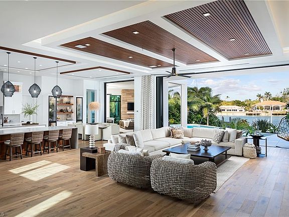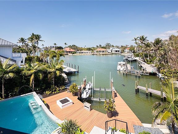 One-of-a-kind masterpiece built in December 2022 (nearly 2023) in the highly sought-after Moorings neighborhood of Naples with breathtaking bay views. Just a 10-minute walk (0.4 miles) to the beach, this architectural marvel offers an unparalleled coastal living experience. As a Moorings resident, you are eligible for membership (at a very low cost) to the exclusive Moorings Beach Park for effortless beach access. This modern estate was custom-built by the award-winning Potter Homes & expertly designed by Adelyn Charles Interior. Designed for the utmost privacy & exclusivity featuring electric motorized entry gates, a solid fortress-like construction of all concrete block, hurricane impact windows/doors throughout & electric hurricane shutters. Every aspect of this property has been crafted with the finest materials & attention to detail, including stunning oak flooring, reverse tray ceilings with wood paneling/uplighting & soaring 14-ft ceilings. Part of the exclusive “Golden 50” in the Moorings, with direct, bridge-free access to the Gulf in just 5 minutes via Doctors Pass. For boating enthusiasts, the home is equipped with dual lifts—one featuring a 30 ft boat lift with a 16,000 lb weight capacity, and the other for dual jet skis. The outdoor living space is a true paradise, with a luxurious pool and spa, fireplace, sun deck with built-in firepit, and a fully equipped summer kitchen perfect for al fresco dining. With 12 ft pocketing floor-to-ceiling sliders, the space effortlessly blends the interior and exterior for seamless waterfront living. Inside, this expansive estate offers 6,900 sq ft under air with 6 bedrooms, 6 full bathrooms (all with dual vanities), 3 half baths, a separate guest house, 3 laundry rooms & a 3-car garage. The state-of-the-art kitchen is a chef’s dream, with custom white cabinetry, dual wood islands with waterfall concrete overlays, high-end Thermador appliances & a butler’s pantry. The main-level primary suite is a private retreat, complete with custom wood ceilings, a wet bar, massive walk-in closets, and a spa-like bathroom with dual vanities, dual water closets, a generous shower with multiple showerheads, dual benches & a separate soaking tub. Upstairs, a spacious living room area with a wet bar, island with bar seating & 3 bedrooms create the perfect space for relaxation, while a sundeck provides breathtaking water views. For ultimate guest privacy, the separate guest villa offers a bedroom, ensuite bathroom, laundry room, full kitchen & private sundeck—ideal for hosting guests. Another highlight of this home is the rooftop observation deck offering sweeping views of the Gulf & Bay—perfect for sunset vistas. Additional features include a private elevator, buried gas propane tank, electric screens, lush landscaping, a spacious front yard ideal for pets & more. An extraordinary sanctuary in one of Naples' most coveted communities, The Moorings, this residence is truly a showcase of visionary design.