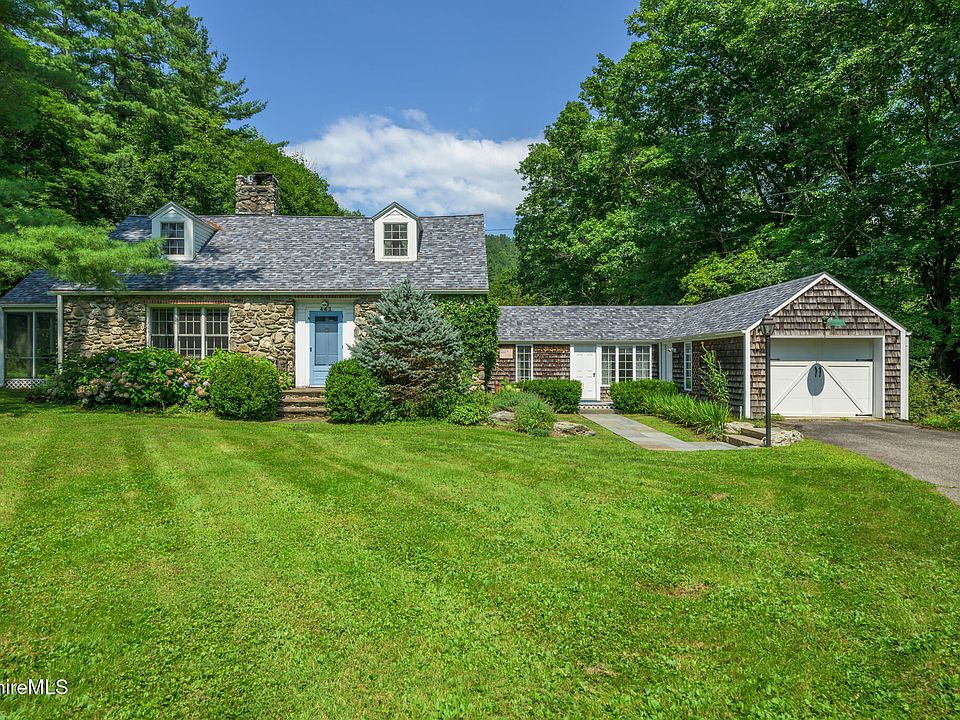 1940's stone cottage sited on 10 acres along the Green River. Main house has a lovely kitchen, with center island and soapstone counters, open to the dining area with French doors to screened porch. Stone fireplace in the living room with recent gas insert for ease of use. There is also a small den, full bath and laundry on this level. Upstairs there are two bedrooms, a hall bath and landing area. Connecting the garage and the main house is a studio with living area, deck looking over the river, a bedroom and bathroom. Land had frontage along Stone Ledge with open meadow along the river.