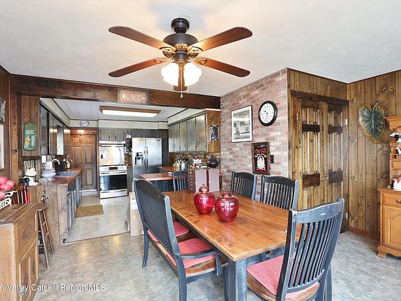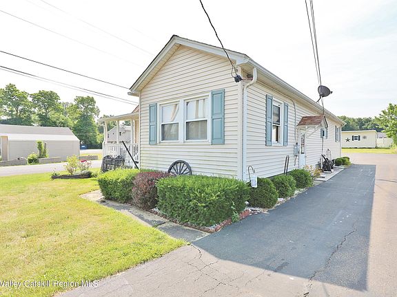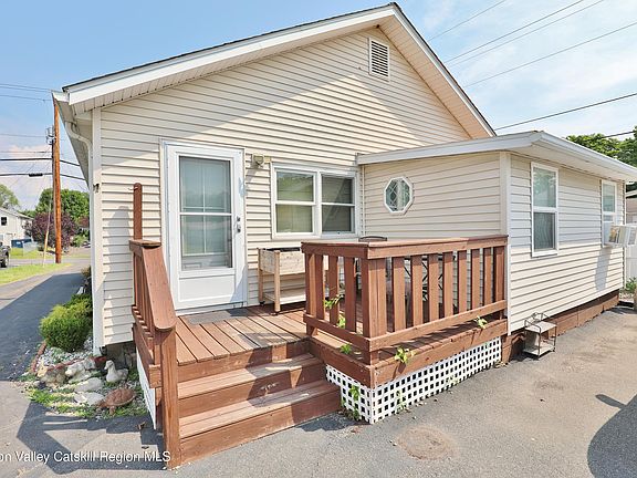 Welcome to this charming ranch in Saugerties! Step into the inviting floor plan featuring a cute country kitchen with a breakfast bar and spacious dining area, perfect for hosting all your favorite gatherings. Enjoy the convenience of one-level living having a laundry closet discreetly tucked away just off the dining area. A cozy living room is just down the hall, with ample windows and access to the front porch, creating a bright and welcoming space. Two generously sized bedrooms are located on opposite ends of the home able to accommodate larger furniture; and two updated bathrooms, each with modern fixtures and newer finishings. Back through the Kitchen you'll find a small staircase that leads to the finished attic for a bonus room graced with new flooring, tongue and groove walls, and ample storage closets. Outside, enjoy plenty of entertainment space with a lovely front porch and a rear deck as well as a paved driveway providing ample parking. The lush fully fenced backyard is perfect for fun activities or gardening and includes two outbuildings, ideal for storage or a workshop. With a new roof installed in 2022, you can enjoy peace of mind for years to come. Whether you are looking for a perfect starter home or downsizing this has it all.