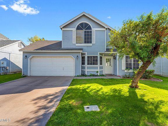 This well-maintained 3 bedroom, 2 full bathroom home offers 1,242 square feet of thoughtfully laid-out living space and a 2 car garage with epoxy floor finish. A very functional floor plan with one bedroom and a full bathroom (shower/tub combo) conveniently located downstairs, perfect for guests, multi-gen living, or work-from-home flexibility. Upstairs you'll find two additional bedrooms and a second full bathroom with shower/tub combo. Inside you'll love the bright kitchen featuring white cabinetry, granite countertops, and all appliances staying with the home. The washer and dryer are included too. The AC system was replaced in October 2025, giving you comfort and peace of mind for the Arizona seasons. Out back is an entertainer's dream with artificial turf for low maintenance, a mature shade tree ideal for summer BBQs, and room to relax or play. The community truly delivers with fenced pool access and generous real grass common areas, great areas to enjoy outdoor time. Located just minutes from the US 60 freeway, commuting is a breeze and you're close to numerous dining and activity hotspots. This home is a rare find in a smaller, quaint subdivision, move-in ready and packed with value. Don't miss your chance to make it yours!