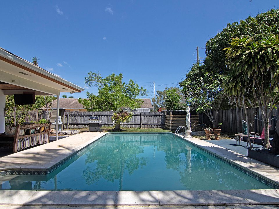 This pool home has 3 bedrooms, 2-1/2 baths with a 2 car garage. This great outdoor space leads to the Pool from the Recreation room and Master Bedroom. The recreation room has a fireplace ,wet bar and a billiards table. This Large Pool 30X15 on a corner lot in sought after Boynton Beach. The home is Landscaped nicely with palm trees. The A/C is 3 years old, roof is barrel tile.tile. This house is perfect for entertaining. There are NO HOA,s. Bike to the Beach. Enjoy the Tropics!