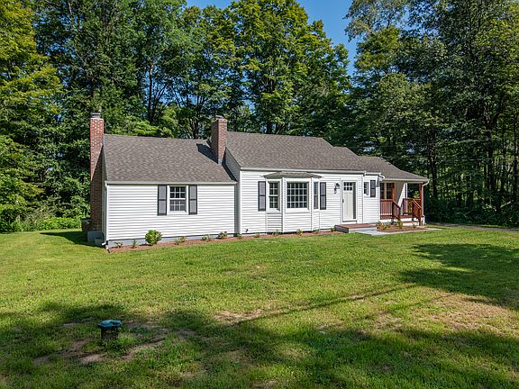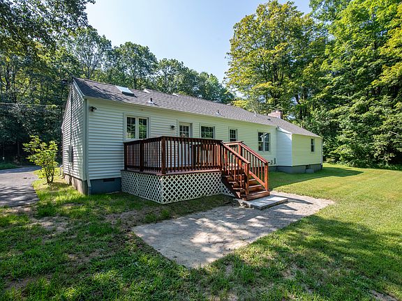 This spacious ranch style house has a new roof, new vinyl siding, some new windows and new deck plus covered front porch. Remodeled eat in kitchen has white shaker style cabinets with granite counter tops, hardwood flooring and stainless steel appliances. Living room has bay window, hardwood floors and fireplace. Two good size bedrooms plus two fully remodeled bathrooms. Formal dining room. There are two accesses from main level to full unfinished basement. House is heated with oil warm air heat. The well and driveway are new. House is situated on large two acre lot with good size back yard.