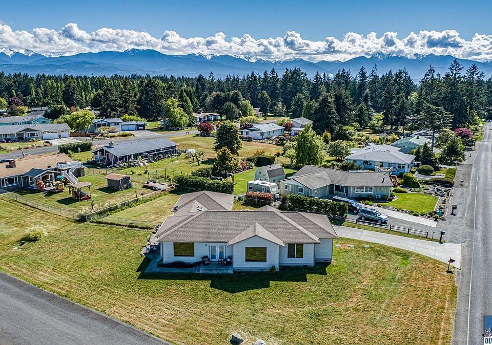 Light, bright, and beautiful! This quiet and peaceful home on a corner lot in Mains Farm comes complete with large picture windows and sweeping views. You will never tire of looking at the Salish Sea, nor The Olympics and Mt Baker. This quality constructed home has skylights throughout, a spacious kitchen with breakfast nook, cozy family room, formal living room, and beautiful dining room with French doors that open up to the back patio. The views are endless! This actively peaceful home is truly paradise.