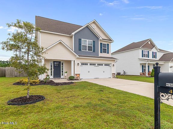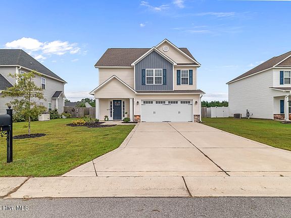 Welcome to Onslow Bay! This sought-after community offers a neighborhood pool, clubhouse, ponds, and sidewalks; all just minutes from Camp Lejeune, schools, shopping, and dining. Step inside this two charming two-story home built in 2020, offering 3 bedrooms, 2.5 bathrooms, and a 2-car garage with approximately 1,765 heated square feet. The foyer opens into the spacious family room, complete with a cozy electric fireplace with marble surround and custom mantle. The open layout flows seamlessly to the dining area and kitchen. The kitchen is equipped with stainless steel appliances, granite countertops, a pantry, and plenty of cabinet space. A laundry room, coat closet, and half bath complete the first floor. Upstairs, you'll find a generous primary suite featuring a ceiling fan, oversized walk-in closet, and a spa-like bathroom with a double vanity, oversized soaking tub, and separate shower. Two additional bedrooms, each with spacious closets, plus a full guest bath round out the second floor. Other highlights include LVP flooring throughout the main living areas and a fully fenced backyard; ready for summer evenings or weekend BBQs. Meticulously maintained and move-in ready, this home is waiting for its next owner. Don't miss your chance to live in one of Jacksonville's most desirable neighborhoods.. schedule your showing today!