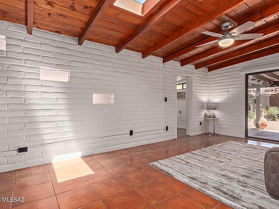 This lovely 2-bedroom 1 bathroom residence features a striking brick facade and low-maintenance desert landscaping. The great room room boasts vaulted ceilings, skylights for natural light, exposed wooden beams, a soothing palette, durable tile flooring and new ceiling fans. The kitchen is outfitted with wood shaker cabinets, new countertops, a stylish tile backsplash, and new stainless steel appliances. You'll also find a den perfect for an office or reading room. Venture outside to the backyard, completed with a covered patio, green house, a functional storage shed, and a warm firepit for evenings under the stars. Newer water heater, efficient central HVAC system, rainwater harvesting setup, double-insulated roofing, and other features.