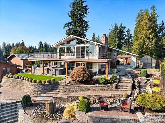 A true Lake Tapps treasure—this Lakeridge home sits above the shoreline, capturing panoramic views of Mt. Rainier, the Cascade range, and the lake’s shimmering waters. Featuring 4 bedrooms and 3 baths, it blends timeless style with thoughtful updates. The spacious living room with fireplace connects seamlessly to a bright, open layout designed for gathering and everyday comfort. Highlights include a remodeled kitchen with induction cooktop (gas ready), steam shower, hot tub, and expansive view deck. On the landscaped .3-acre lot, enjoy 70' of waterfront, covered boat lift, dock, fire pit, RV parking, and covered patio. Ownership includes access to Jenks Park, boat launch, Lakeridge amenities, and dog park—the ultimate Lake Tapps experience.