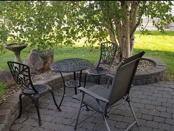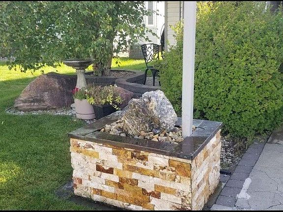 Professionally landscaped yardBubble rock water featureCozy brick patioOverhanging gray birch treeLilac shrubLandscape bouldersThree level deck