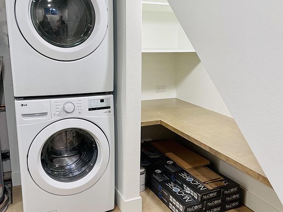 Built-in work deskPremium plank flooringSpa-like bathroomBeautiful quartz countersLg washer and dryer