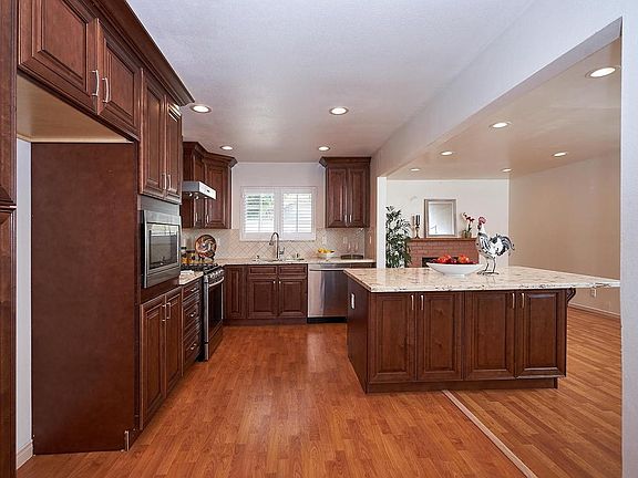 You will love this charming 3 bedroom, 2 bath single story home featuring laminate wood floors with baseboard moldings, plantation shutters and recessed lights. Newly remodeled kitchen boasting sleek quartz countertops with breakfast bar, oversized center island, polished arabian ceramic tile backsplash, self-closing cabinetry with pullouts and stainless steel appliances. Huge family room perfect for gathering with family and friends. Two car garage with utility sink, tile floors and extra large custom built cabinets. Backyard has mature exotic fruit trees such as delicious Persimmons, sweet Cherimoyas and Tangerines. Driveway has plenty of parking including RV access. Come see this lovely home and make it yours just in time for the holiday season!
