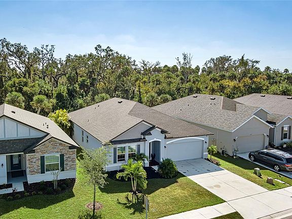 Crafted with space, privacy, and thoughtful design at its core, this 2020 Maronda Homes build elevates everyday living with an open great room layout and purposeful features throughout. This 3-bedroom, 2-bath residence spans over 1,900 square feet and blends modern comfort with meaningful efficiency—Maronda homes are built to be at least 15% more energy efficient than many new construction homes, helping reduce energy use and lower monthly utility costs. The expansive great room flows seamlessly into a large kitchen outfitted with Samsung stainless steel appliances, a central island, a dedicated coffee bar, and a rustic white-brick backsplash. Just inside the front entry sits a spacious den/office that can easily flex into a 4th bedroom, while a reimagined coat closet has been transformed into a charming reading nook. Sliding doors frame peaceful wooded-preserve views and open to a screened lanai with an above-ground hot tub—an ideal place to unwind with nature as your backdrop. A classic barn door separates the secondary bedrooms and bonus room for added privacy. The primary ensuite offers generous proportions and overlooks the same serene preserve setting. Bedrooms 2 and 3 share a centrally placed bonus room highlighted by a real red-brick accent wall, making it a perfect playroom, media retreat, or second office. The covered rear lanai features a custom-painted concrete floor that coordinates with the front entry and is exceptionally easy to maintain. The backyard is thoughtfully landscaped to maximize privacy and enhance the preserve-side environment. Willow Walk offers a community pool, playground, and central mailboxes, with Ellenton Premium Outlets and abundant dining options just minutes away. Quick access to I-75 provides easy commuting to Sarasota, St. Petersburg, Tampa, and beyond.