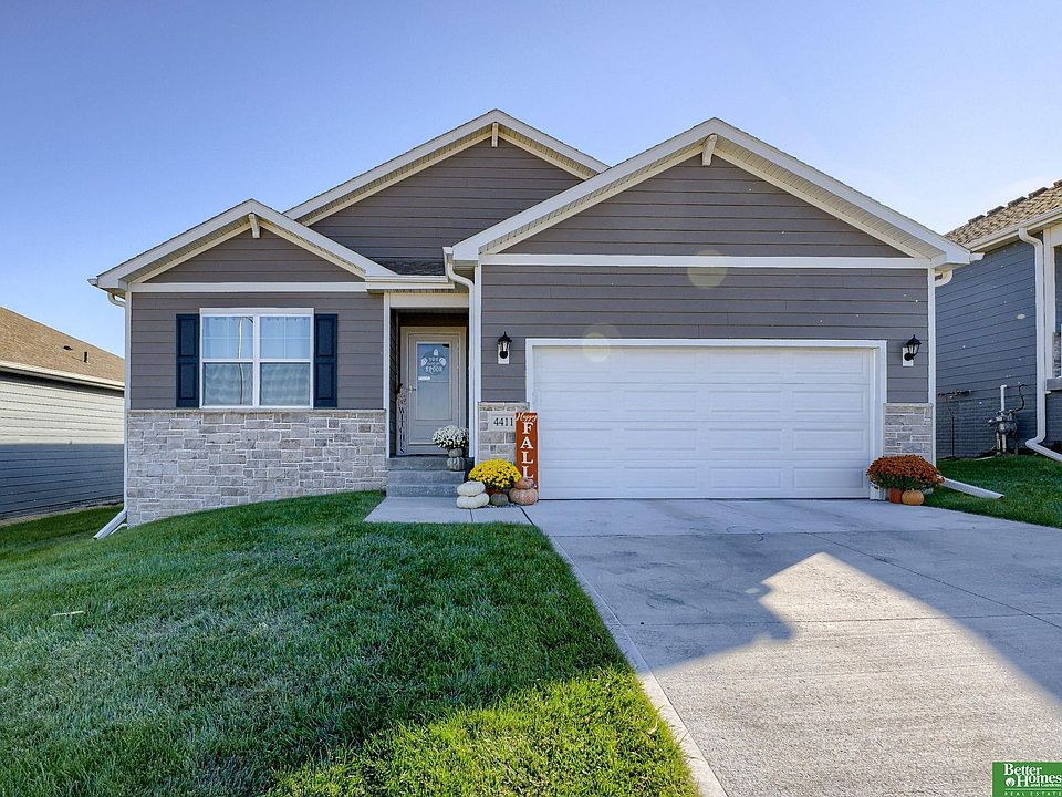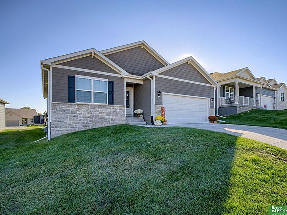 Nearly NEW with no backyard neighbors! Welcome home to EASY living at this nearly perfect Bellevue 3 bed 2 bath ranch villa located in Belle Lago. Relax knowing that lawn care, snow removal, and trash service are all included! Step into a bright and open main level with gorgeous LVP flooring ideal for gatherings with friends and family or enjoy a relaxing night in with a spacious living room featuring a beautiful linear fire place and a fantastic kitchen equipped with quartz countertops, stainless steel appliances, walk-in pantry, center island with breakfast bar seating, and a great-sized dining area with sliding door access to the deck. Convenient main level laundry room. Primary suite boasting a full bath with dual sinks, quartz countertops and a large walk-in closet. Two additional main level bedrooms and a second full bath. Enjoy the neighborhood walking trails and large lake! Seller paid HOA fees for the remainder of the year. No fencing is permitted by the Villa association. AMA