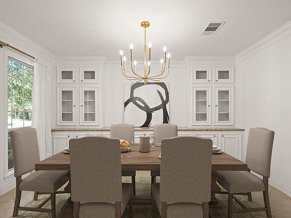 Gas log fireplaceBrick and stone exteriorOutdoor gas stubCrown mouldingFloor-to-ceiling picture windowsTile floorsBuilt-in bookshelves