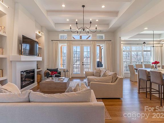 This stunning custom home is thoughtfully designed in the highly desirable Rock Barn Country Club and Spa community. Crafted with luxurious, timeless details, it creates an inviting, elegant atmosphere. An arched entryway welcomes you from the foyer into the living room, setting the tone for the elegant millwork throughout the house. Bathed in natural light from tall windows, the home feels bright and airy. High ceilings, delicate white beams, and tray ceilings add depth and character, while the custom fireplace and built-ins blend functionality with sophistication. The heart of the home is the gourmet kitchen, featuring a breathtaking waterfall-edge quartz island, matching backsplash, and designer lighting. Each bathroom offers a spa-like retreat with marble and porcelain tile. The back deck, accented with wooden beams, provides a serene space for relaxation and entertaining. This home is truly a masterpiece of design and craftsmanship.