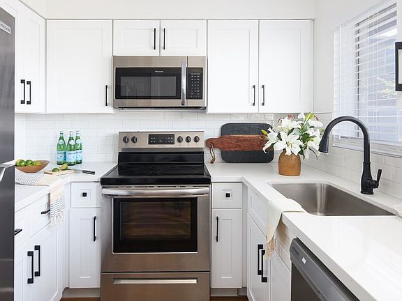- High-end kitchen featuring quartz countertops, stainless steel appliances, and white shaker cabinets with soft-close hinges