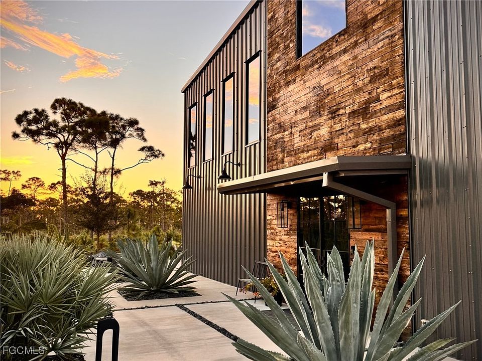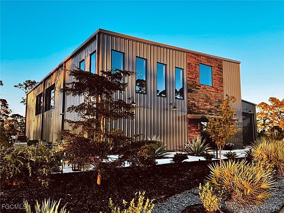 Welcome to Blackstone, designed and built by Blue Sky Design + Allied Steel [known for work with Tesla, NASA, and Rolls Royce] offers a peaceful, modern, and comfortable lifestyle that is an effortless extension of its natural surroundings. Tucked deep in the Florida Pines and Palmettos on 10 dry acres (no wetland), backing up to a 567-acre protected preserve. This 7,500 SF Modern Farmhouse is one of the most architecturally striking and structurally sound homes in all Southwest Florida. Constructed with solid concrete on both floors, PGT hurricane windows & doors, and red iron structural steel. This is where years of design, engineering, and lifestyle come together in an unforgettable way. From the custom iron front doors, Redwood cladded walls, custom welded open staircase in the atrium, and massive Edison Bulb chandelier - every element is a full sensory experience. Ultimate livability with a 4,000 SF 1st floor with primary suite & bedrooms, and a 3,500 SF 2nd floor living space with flex room/studio. The second floor offers an open concept with dedicated spaces for dining, entertaining, and gaming. Imagine, as a family, sharing a space even when you are working on separate activities. No other home offers a sense of togetherness and privacy like this. Enjoy a cinematic experience with a dedicated professional Dolby Atmos theater/screening room equipped with 126” digital 8K projection, acoustically treated walls & ceilings, custom lighting, and an audio system engineered to rival commercial theaters. A cool blend of luxury and nature. Cambria Quartz counters, modern art, industrial steel beams and concrete meet mature trees and private walking paths, a 3/4 acre pond and ATV trails. Dedicated wine room with professional wine racks and separate shelving for 200 bottles of beer storage/aging. Restaurant-style full bar with Zephyr full-size appliances and built-in speakers! Professional whole home AV system with 10 independent audio zones, JBL professional speakers and Crown amplifiers. Built for those who want to live, work, and play without compromise. Bunker strength, tech room, dedicated Xfinity pedestal & LCEC transformer, underground utilities. 5 min. from local marinas & boat launches. The property is at/above newest flood elevation — never flooded. The 70x30 garage [2,100 SQFT] is an attached multi-car garage with 28 ft ceilings and drive-through access for 60+ ft vehicle/motorcoach, boat, or toys. It has (3) 12’x14’ custom [Overhead Door] roll-up doors, front & rear concrete pads for equipment, trailers, or concealed storage. Prewired for a 20-amp exhaust system, professional JL audio PA speaker system, epoxy floor, 30,000 lumens high bay lighting, and 400 amp electrical service, and (2) industrial fans. Whether you're hosting a party, showcasing a car collection, catching a movie in your private theater, or escaping to a fortress of tranquility, this one-of-a-kind estate is unforgettable. There is nothing else like Blackstone.