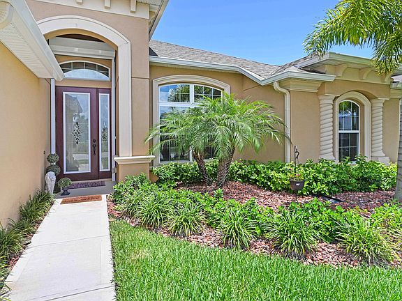 Stunning 2018 built pool home w/oversized 2 car garage in top rated school districts. Open floorplan w/formal dining. Kitchen features a gas cooktop, island & nook seating, granite counters & stainless appliances. Laminate wood-look flooring with high profile baseboards. Extensive upgrades including leaded glass entry door, electric roll down & accordion shutters, tankless HWH, designer light fixtures & fans, plantation shutters and sheer vertical drapery blinds. Washer & gas dryer and second fridge in garage convey. The screened salt water pool has jet spray accents & solar heating. Lush landscaping & vinyl fencing. Water treatment system at garage sink. A short drive to the beach and PAFB as well as easy access to I-95 for a quick commute. View the 3D Matterport Virtual Tour.