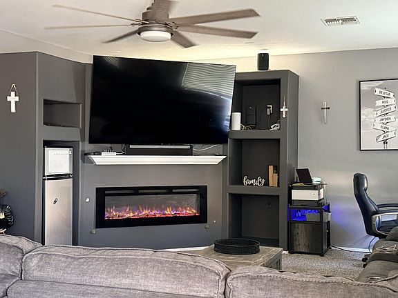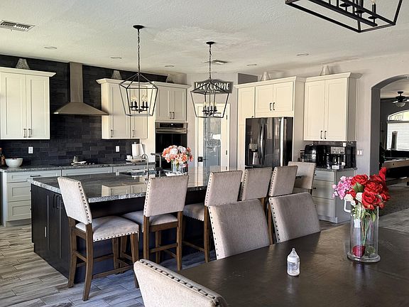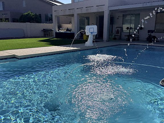 A Beautiful Home at an Affordable Price. Spacious 5 bedrooms with that coveted one bedroom downstairs. ceiling fans and recessed lighting in all rooms. New Tile in high Traffic areas. Custom Entertainment wall unit with an electric fireplace. Awesome Entertainment Backyard with no time-consuming Landscape. Enjoy the Giant 44'x22' play Pool and lush Turf for family get togethers. French Doors lead to Large Extended Patio with outside bar seating. Buyers will love the Gourmet Kitchen with upgraded hanging lights, top of the line cabinets, farm sink and a massive 10'x7' Quartz Island with under cabinet storage. This home has a 3 Car Garage with 4 Car outside slab. Plenty of room inside and outside and a must-see property. Owned Solar.