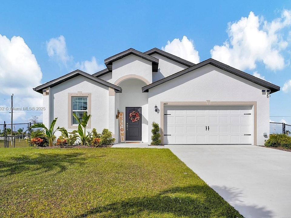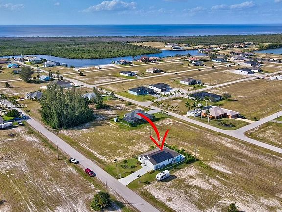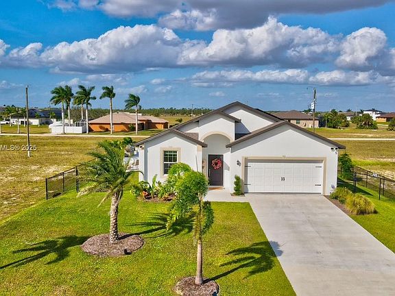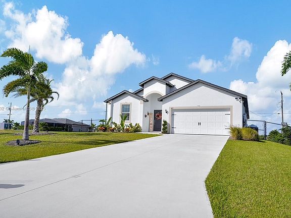 Open-concept layout with high ceilings. Kitchen features granite countertops, Whirlpool stainless steel appliances, wood cabinetry with crown molding, Moen faucets, and LED lighting. Formal dining room. Primary bedroom includes walk-in closet and ensuite with dual sinks, shower, soaking tub, and linen closet. Backyard offers fenced deck, heated saltwater pool with spa, manicured lawn, landscaping, and irrigation system. Additional features: reverse osmosis water system, solar panels with backup batteries, two-car garage with Wi-Fi door opener. Smart-home controls for pool, solar, alarm, and cameras via smartphone. Lanai with screened deck & pool. All furniture beds, sofas, tables, and etc., included. Located in NW Cape Coral, approx. 5 miles from Burnt Store Marina, and near local schools.