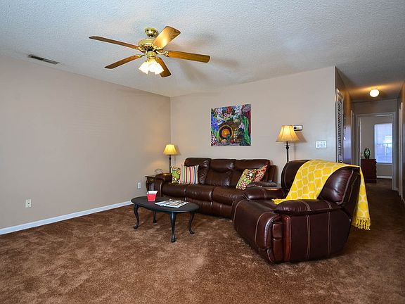 Lovely poolOpen floor planCeiling fansCarpet and tileFull kitchen