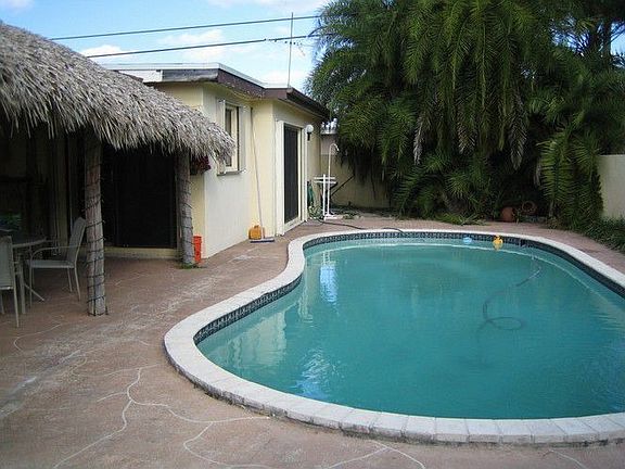 GREAT STARTER POOL HOME. 2/1 WITH LR, DR AND FAMILY ROOM WITH BAR. NICE POOL/PATIO AREA W/CHICKEE HUT FOR ENTERTAINING. PRIVATE WALLED IN YARD ON QUIET STREET. UPGRADED FLOORING & HURRICANE SHUTTERS.