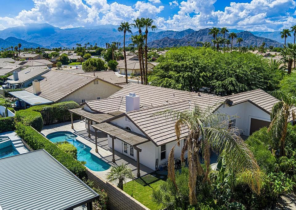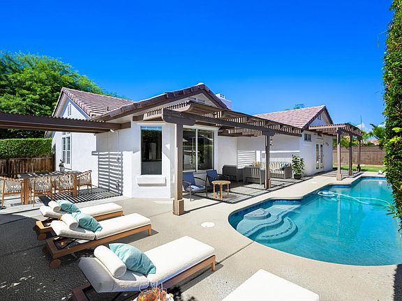 Welcome to 44150 Sweet Bush Lane, La Quinta, CALocated in the highly desirable Cactus Flower neighborhood of North La Quinta, this home offers the perfect blend of comfort and functionality -- all with no HOA fees.This spacious single-story home features a highly sought-after floor plan with 4 bedrooms and 2 bathrooms, including a flexible 4th bedroom currently used as a den with a custom built-in desk area -- ideal for a home office or study. Enjoy multiple living spaces with both a formal living room and a cozy family room, plus a charming breakfast nook just off the kitchen.The kitchen features granite countertops and ample cabinetry. Both bathrooms have been tastefully updated with contemporary design touches. The primary suite features a spacious walk-in closet, French doors that lead to the backyard with direct access to the sparkling pool.Step outside to the entertainer's yard, complete with a lap pool, multiple seating areas, and mature landscaping that provides beauty and privacy.Additional highlights include:3-car garagePlantation shuttersRecessed lightingGas fireplaceRecent upgrades for peace of mind:New roof (2020)Pool resurfaced (2023)New AC unit (2024)New water heater (2021)New refrigerator (2023)This home is ideally located near top-rated schools, shopping, dining, golf courses, and everything La Quinta has to offer.